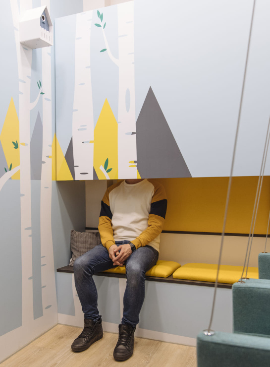 Die acht interaktiven Stationen verteilen sich auf zwei Ebenen. Das Verbindungselement ist eine Rutsche – wahrscheinlich die einzige, die jemals in einem Bus verbaut wurde. Für positive Stimmung sorgen außerdem das Farbkonzept und die sorgfältig geplante Innenarchitektur mit vielen natürlich anmutenden Materialien und Elementen.
