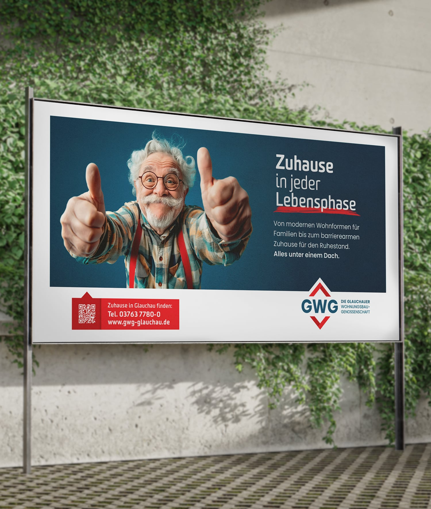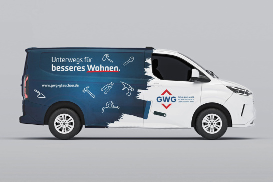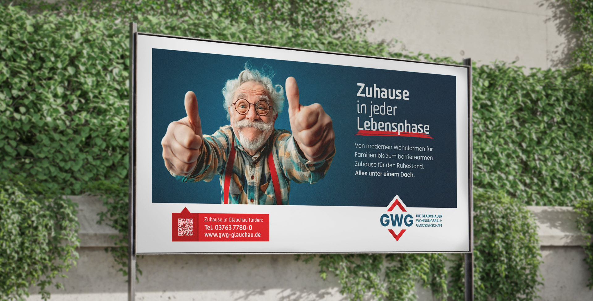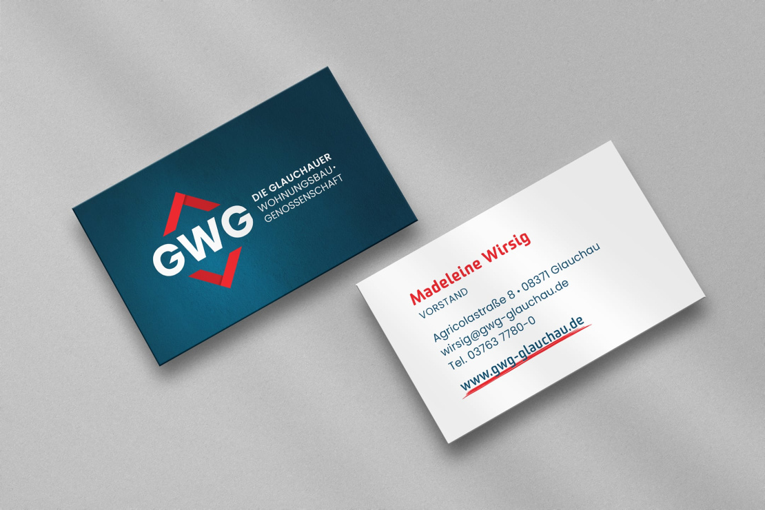 Auch die Wortmarke wurde geschärft: „GWG“ steht klar und selbstbewusst im Fokus, und mit dem Artikel „die“ entsteht die prägnante Bezeichnung „die Glauchauer“. Formulierungen wie „Ich wohne bei der Glauchauer“ werden dadurch fast selbstverständlich. Farblich verankert dunkles Blau die Marke als seriöse Basis, während kräftiges Rot gezielt Akzente setzt.